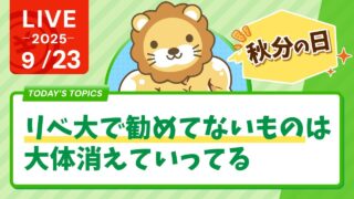 リベラルアーツ大学 【お金の勉強ライブ】今日は秋分の日!祖先に感謝しつつ、今日を精一杯楽しんでいこう&みんなは何にお金を使う?【9月23日8時30分まで】 ▼「1年後の資産が着実に増える!成果コミット型お金の学校『リベシティ』 ✓会員の「収入」と「資産」を増やす、日本最大規模のお金のコミュニティ ✓登録無料、初月会費無料、退会時違約金一切なし ✓限定特典多数(シティ内限定ライブ、シティ内... 2025.09.23 リベラルアーツ大学